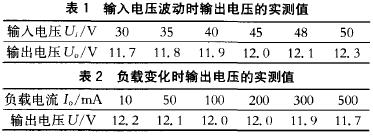 表1为输入电压在30~48 V波动时,输出电压的波动情况。表2是负载电流在10~500 mA变化时,输出电压的波动情况。