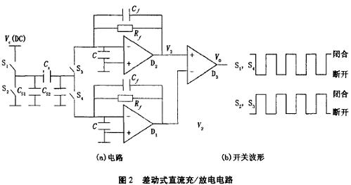充/放电电容测量电路典型的例子为差动式直流充放电C/V转换电路,如图2所示。