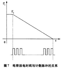 电流源Io为4DH型精密恒流管,它与电容C通过电子开关K串联构成闭合回路,电容C的两端连接到电压比较器P的输入端,测量过程如下:当K1闭合时,基准电压给电容充电至Uc=Us,然后K1断开,K2闭合,电容在电流源的作用下放电,单片机的内部计数器同时开始工作。当电流源对电容放电至Uc=0时,比较器翻转,计数器结束计数,计数值与电容放电时间成正比,计数脉冲与放电时间关系如图7所示。