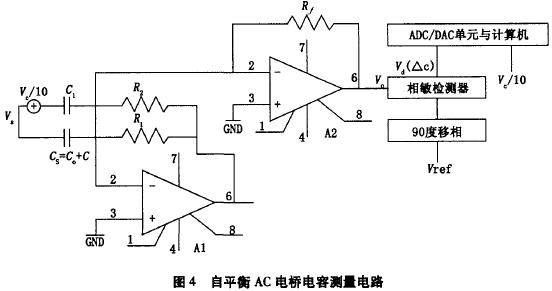 图3电路的缺点是无自动平衡措施,为此可采用图4所示的自动平衡AC电桥电容测量电路。