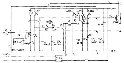 图1所示为EXB841的内部电路和典型应用电路图,主要有3个工作过程:正常开通过程、正常关断过程和过流保护动作过程.14和15两脚间外加PWM控制信号,当10~15V的正向触发控制脉冲电压施加于15和14脚时,在GE两端产生约16 v的IGBT开通电压;当触发控制脉冲电压撤消时,在GE两端产生约-5.1 V的IGBT关断电压.过流保护动作过程是根据IGBT的CE极间电压Uce的大小判定是否过流而进行保护的,Uce由二极管V7检测.当IGBT开通时,若发生负载短路等产生大电流的故障,Uce上升很多,会使得二极管V7截止,EXB841的6脚“悬空”,B点和C点电位开始由约6 V 上升,当上升至13 V 时,Vs1被击穿,V3导通,C4通过R7和V3放电,E点的电压逐渐下降,V6导通,从而使IGBT的GE间电压Uge下降,实现缓关断,完成EXB841对IGBT的保护.E点电位Ue为-5.1 V,由EXB841内部的稳压二极管Vs2决定.