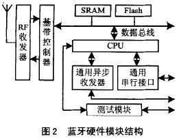 由图2 可知,它由微处理器(CPU) 、无线收发器(RF)、基带控制器(BB) 、闪存( Flash 程序存储器) 、通用异步收发器UART(Universal Asynchronous Receiver Transmitter)、通用串行接口USB(Universal Serial Bus)及蓝牙测试模块组成。其中蓝牙基带控制器是蓝牙硬件模块的关键模块。其主要功能是在微处理器控制下,实现蓝牙基带部分的所有实时处理功能,包括负责对接收的bit 流进行符号定时提取和恢复;分组头及净荷的循环冗余度校验(CRC) ,分组头及净荷的前向纠错码FEC 处理,加密和解密处理等,且能提供从基带控制器到其它芯片的接口等。CPU一般采用RISC 结构的嵌入式微处理器,如ARM7TDMI微处理器,才能满足对蓝牙核心协议的高速处理和大量数据bit 流的处理。Flash 存储器用于存放基带和链路管理层中的所有协议软件。SRAM 作为CPU 的运行空间,在工作时把Flash 中的软件调入SRAM 中处理。射频收发器负责接收或发送高频的通信信号。UART 和USB 接口提供到HCI 的主机控制器接口传输层的物理连接,是上层协议与蓝牙硬件模块进行通信的通道。蓝牙测试模块主要提供无线层和基带层的认证和一致性规范,同时还管理产品的生产和售后的测试,为可选模块。