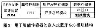 本文通过对蓝牙协议栈结构的讨论,提出一个嵌入式SoC 器件结构。这个嵌入式SoC 器件是一种具有蓝牙通信功能的SoC 器件;SoC 中的CPU 对用户开放,用户可以使用这种结构的SoC 器件实现智能传感器或控制器单元。