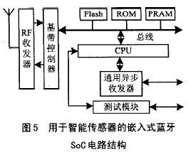 对于智能传感器来说,传输数据量一般并不是很大( 例如压力、温度等传感器) ,因此,满足智能传感器需要的嵌入式蓝牙SoC 器件中,并不需要很大的存储容量;但必须考虑蓝牙协议实现所必需的程序存储空间。