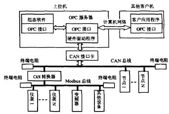 系统的总体设计方案如图2所示。由于大多数组态软件不支持CAN总线,因此组态软件和CAN总线数据交换通常采用DDE方式和OPC方式。笔者采用ZLGCAN接口卡和ZOPC SERVER,以OPC方式实现组态软件与CAN总线的数据交换。连接在计算机网络中的其它客户端应用程序也可以通过OPC接口访问现场的数据,很方便地实现数据的远程监控。在整个控制系统中,CAN现场总线作为上层监控网络,上位机通过CAN接口卡与CAN总线上的各个节点连接.Modbus总线作为应用设备层网络.用于连接Modbus仪表设备、支持Modbus协议的变频器等,通过CAN转换器实现Modbus总线到CAN现场总线的转换。从而实现上位机监控软件对Modbus总线网络的各设备进行配置和数据监控。此系统具有开发成本低、应用灵活、易于管理等特点。