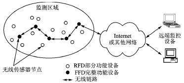 无线传感器网络由大量低功耗、低速率、低成本、高密度的微型节点组成,节点通过自我组织、自我愈合的方式组成网络。图1给出了无线传感器网络的工作原理,图中分散的无线传感器节点通过自组织方式形成传感器网络。节点负责采集周围的相关信息,并采用多跳方式将这些信息通过Internet或其他网络传递到远端的监控设备。