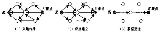 定向扩散是基十查询的按需路由,汇聚点发出查询消息,形成反向的从数据源到汇聚点的数据扩散梯度,数据沿着梯度传送到汇聚点。定向扩散包括周期性的以下基本操作过程(参见图3):