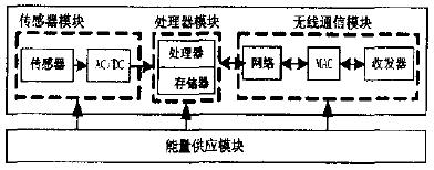 传感器节点由传感器、处理、无线通信和能量供应四个模块部分(图2)。传感器模块负责环境信息的采集和数据转换;处理模块控制整个传感器节点的操作,处理本身采集的数据和其它节点发来的数据,运行网络协议使传感器节点互联为网络以便协作工作;通信模块负责与其它传感器节点进行通信,交换控制消息和数据消息:能量供应模块为传感器节点提供运行所需的能量,通常是微型蓄电池。