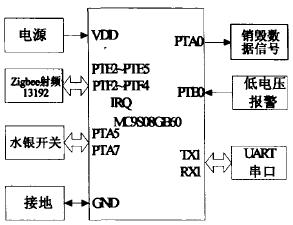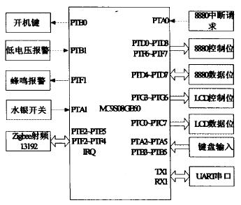 ①MCU模块子机MCU同样采用MC9S08GB60型单片机。子机原理图示于图6。