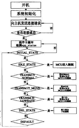 子机MCU的软件开发环境为Freescale公司的CodeWarrior环境,采用Freescale已经编写好的MAC层软件,通过c语言编程完成功能 。MCU软件流程示于图7。
