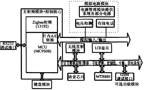 监控座机主要由单片机测控系统组成,包括MCU模块、Zigbee射频模块、语音报警模块、键盘显示电路模块、电源/充电电池模块和Modem拨号模块。监控座机框图示于图2,各模块说明如下。