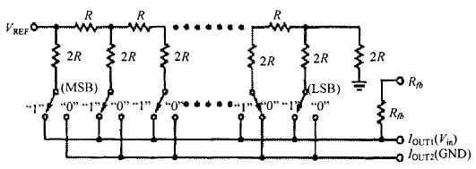 当有一个或多个数码控制的双置开关放到“1”的位置时,它们与IOUT1连通即和高电平(Vin即Iout1端的电平)连通。根据线性电路的叠