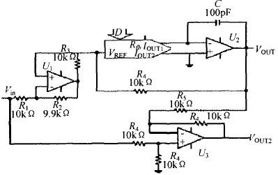 它由DAC和两个高精度的运放实现。U1和电阻R1~R4构成差分输入的电压控制电流源,经DAC分流后,最后是由运放U2和电容构成的倒向积分器。这样构成了传递函数为H(s)=1/(1+τS),转折频率为1/τ的一阶低通滤波器,其中τ= R2C× 2n/D 。即实现了由DAC数字端程控的高精度低通滤波器。