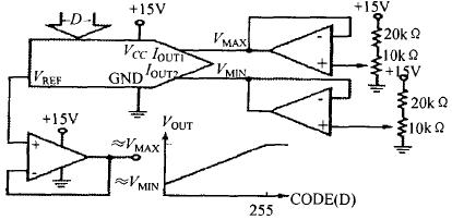 (2)为这种接法有两个输入端且与地是隔离的,所以这种接法不要求DA变换模拟量,边界必须有一个是0, 即可以在任意指定DA变换模拟正电压的范围,图5是一种使用8位DAC0832实现的从正电压Vmax到Vmin数模转化的电路。