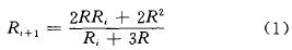 用数学归纳法证明之,假设上述命题成立。当最高位(MSB)与高电平接通时显然最高位的右边仍是一个梯形网络,电阻为2R,故输出电压为2-1×Vin,满足假设。当第P与高电平接通时,如图4设梯形网络中阻值为R的各个电阻之间的点为1,2,……,n ,n-1这些以左的电阻对地的阻值为R1,R2,……,Rn 。则可以得到Ri与Ri+1之间的递推关系是:Ri+1 等于(Ri+R)并联上2R,即: