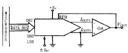 (3)一般DAC带有从电流输出脚和VREF之间的二极管, 所以这种接法不能进行负电压值的DA变化, 即IOUT1,IOUT2端不能接负电压。