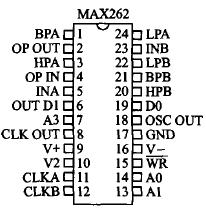 MAX262芯片是Maxim公司推出的双二阶通用开关电容有源滤波器,可通过微处理器精确控制滤波器的传递函数(包括设置中心频率、品质因数和工作方式)。它采用CMOS工艺制造,在不需外部元件的情况下就可以构成各种带通、低通、高通、陷波和全通滤波器。图1是它的引脚排列情况。