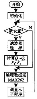 采用汇编语言编程,MAX262的地址A0~A3与数据D0D1的关系如表1所列。由表1可看出,每个滤波器的工作模式 中心频率 、品质因数Q值所需编程数据,均需分8次写入MAX262的内部寄存器才能完成设置。系统的主程序流程(单片机主程序)如图5所示。