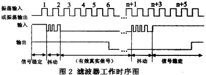 图2为滤波器工作时序图。假设当移位寄存器所有位均输入低电平时,信号最终输出为高电平;反之,输出信号为低电平。在时钟脉冲1的下降沿,输入信号已达低电平,一个高电平就输入至该移位寄存器的第一位,当这一脉冲的下降沿过去时,输入信号又转为高电平,引起移位寄存器的所有位复位至低电平,于是一个时序重新开始。在时钟脉冲3至6的上升沿之间,输入信号保持低电平,因此高电平被传至移位寄存器的所有的四个位上,到下一个时钟脉冲的上升沿期间,输出转为低电平。N+1个时钟脉冲过去后,输入抖动为低电平,寄存器所有位都置于高电位;在N+2个脉冲到来时,状态不发生变化,这是因为输入输出都是低电平,且该移位寄存器的所有位均为高电平;在N+3个脉冲以后,输入信号为清晰的高电平信号;到N+6个脉冲的上升沿,因为四个低电平被移入移位寄存器,故输出转为高电平。
