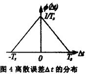 下面根据概率论的原理估计离散误差的最大值。由于△T的起点和终点脉冲以等概率的几率落在Ts间隔内,因此随机误差△ts及△te都服从均匀分布。而总误差△t则服从图4所示的三角形分布