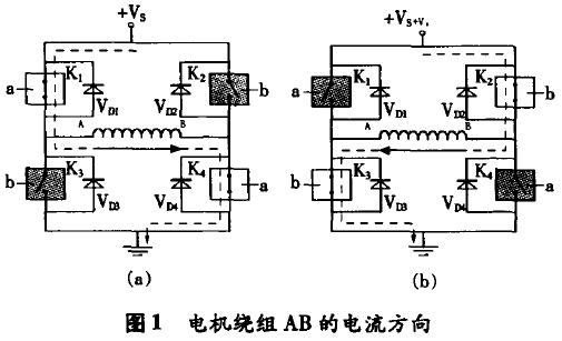 4个开关K1和K4,K2和K3分别受控制信号a,b的控制,当控制信号使开关K1,K4合上,K2,K3断开时,电流在线圈中的流向如图1(a),当控制信号使开关K2,K3合上,K1,K4断开时,电流在线圈中的流向如图1(b)所示.4个二极管VD1,VD2,VD3,VD4为续流二极管,它们所起的作用是:以图1(a)为例,当K1,K4开关受控制由闭合转向断开时,由于此时线圈绕组AB上的电流不能突变,仍需按原电流方向流动(即A→B),此时由VD3,VD2来提供回路.因此,电流在K1,K4关断的瞬间由地→VD3→线圈绕组AB→VD2→电源+Vs形成续流回路.同理,