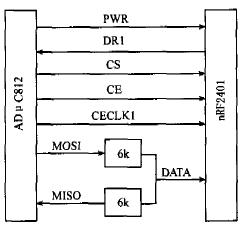 本例是作者设计的单片机,ADuC812的SPI总线与射频无线通信模块nRF2401间的通信接口,由于nRF2401只支持I/O数据传输方式,但是为了提高无线通信的数据速率,作者采用单线方式实现了SPI与nRF2401的通信。