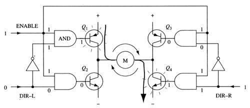 采用以上方法,电机的运转就只需要用三个信号控制:两个方向信号和一个使能信号。如果DIR-L信号为0,DIR-R信号为1,并且使能信号是1,那么三极管Q1和Q4导通,电流从左至右流经电机(如图4.16所示);如果DIR-L信号变为1,而DIR-R信号变为0,那么Q2和Q3将导通,电流则反向流过电机。