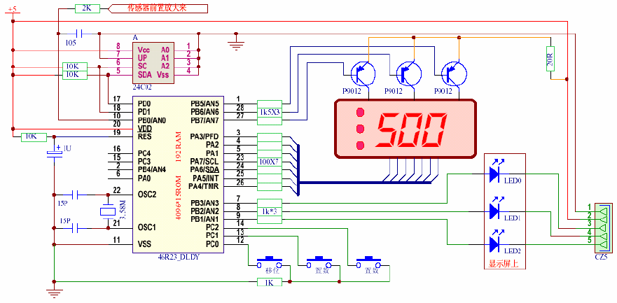 传感器的接入非常简单,从系统的 5V 供电端仅仅通过一支 3K92 的电阻就连接到 PT100 了.这种接法通常会引起严重的非线性问题,但是.由于有了单片机的软件校正作为后盾,因此就简化了传感器的接入方式.