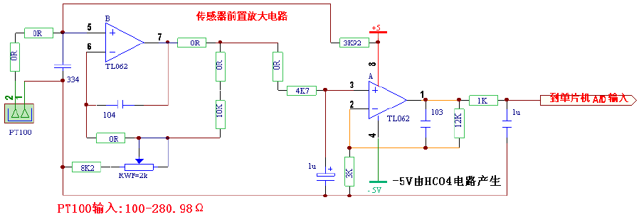 温度传感器PT100是一种稳定性和线性都比较好的铂丝热电阻传感器,可以工作在 -200℃ 至 650℃ 的范围.本电路选择其工作在 -19℃ 至 500℃ 范围.