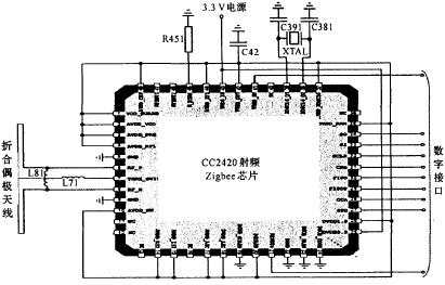 目前,在投入应用的Zigbee射频芯片中,CC2420是应用较广泛的一种。CC2420是标准的Zigbee芯片,符合Zigbee联盟的规定协议;采用直接序列扩频的方式进行数据收发,工作在ISM的免费2.4 G频带;可同时工作为全功能节点(FFD)和缩短功能节点(RFD);输出信号可调且可完成接收信号强度指示(RSSI);采用CRC16、AES硬件加密等方式来保证数据传输的安全可靠。CC2420封装形式为QLP-48 package,大小仅为7×7 mm,高度集成性可将无线传输模块硬件电路模块设计成很小的尺寸,方便与其他电路连接。其典型连接如图3所示。