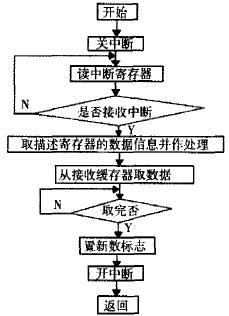 在接收到主机的发送请求后,发送程序启动发送命令。数据从CAN控制器发送到总线是由CAN控制器自动完成的。数据从CAN总线到CAN控制器的接收缓冲区也是由CAN控制器自动完成的。接收程序只需从接收缓冲区读取数据,并将其存储在数据存储区。接收和发送数据的中断程序流程如图5、图6所示。