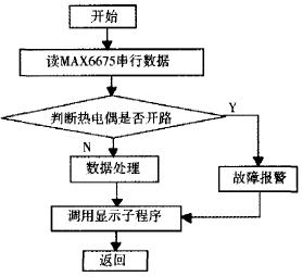 在系统设计中,温度测量这一部分程序作为一个独立的程序段可定时调用。其主要包括MAX6675数据读取、开路判断、数据处理和码制转