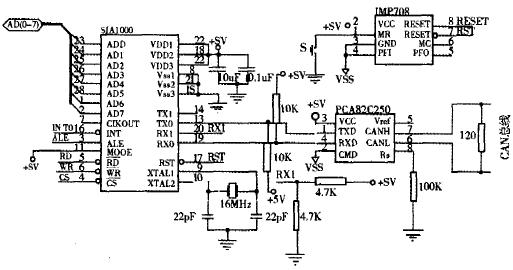 IMP708具有2个复位输出RESET和RESET ,分别接到AT89C51和SJA1000。当按下按键S时,为手动复位。IMP708芯片有上电复位、看门狗和电源监控功能。