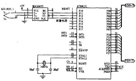 从AT89C51的P13端口给MAX6675发送串行时钟,P11端口用来接收MAX6675输出的温度数据;P0口作为数据输出,即将温度信号编码后输出
