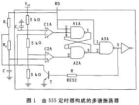 555定时器构成多谐振荡器来产生脉冲如图1所示。接通电源后,电容被充电,Vc上升,当Vc上升到2/3Vcc时,触发器被复位,同时放电BJTT导通,此时Vo为低电平,电容C通过R2和T放电,使Vc下降。当Vc下降到1/3 时,触发器又被置位,Vo翻转为高电平。电容器C放电所需时间为: