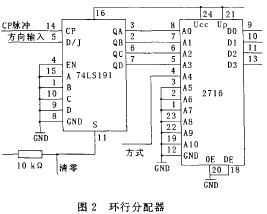 由74LS191和EPROM27l6组成的脉冲分频器和环形分配器如图2所示。