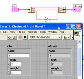- 凡是用到 cluster 的地方,就为它造一个类型定义(《在程序中使用类型定义》),在程序所有要用到这个 cluster 的地方,都使用类型定义的实例。这样一是可以保证所有的 cluster 都完全一致,避免图4 这种错误;二是一旦需要变动 cluster 中的元素,只需在类型定义中更新就可以了,不必挨个 VI 修改。