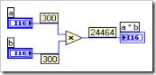 图1 中的 VI 只做了一个简单乘法 300*300 ,不加思索就应该知道答案是 90000,但程序中乘法节点给出的结果却是 24464。乘法节点是不会错的,错误是由于程序中使用的数据类型是 I16。I16 能表示的最大数目只有32767,所以在乘法计算中出现了溢出。