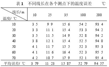 模块转换, 输入到计算机。三个PT100 的探头放在同一盛水的容器中, 逐渐加温, 取不同温度下的测量值。经过把实验数据中图2 接法数值减去标定温度作为绝对误差, 列出绝对误差与线长在各个测点下的数值, 结果见表1 。