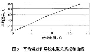 通过图3 曲线, 可以看出, 用图2 接法测得的温度平均误差与导线电阻呈近似线性关系, 与理论分析的结果相吻合。