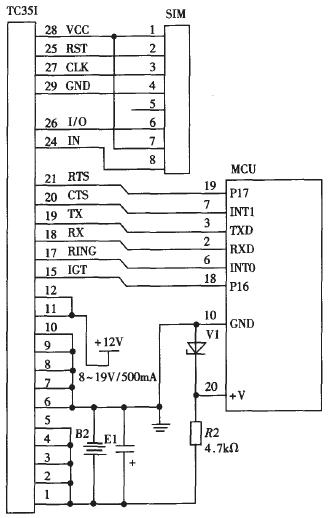 TC35I接口由40芯电缆组成.其中1~5脚接电池的“+”端,6~10脚接电池的“-”端,11~12脚为直流电源输入端,可输入8~20V/500mA的直流电.内部有自动充电控制电路。15脚IGT为模块开机控制,31脚EMERGOFF为关机控制,都是低电平有效,也可以通过命令实现开关机。17脚为振铃输出,18脚Rx为串行数据输出,19脚TX为串行数据输入,32脚为工作状态指示灯输出,24~29脚接SIM卡。与微处理器的接口电路如图4所示。通信速率为19.2kbps。