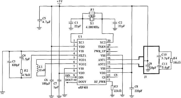 无线数据通信电路主要担负机动车辆与固定基站系统进行近距离的无线数据交换任务。由核心芯片nRF401及其附属元件组成。nRF401是双信道、高性能、低功耗的专用无线通信芯片,工作频率为433.93/434.33MHz.工作电压为3.3v,最高通信速率为20kbps,可以直接与单片机串口相接,进行异步通信,实现数据发送和接收.无需对数据进行编码。数据输入端DIN与单片机的TxD端相接,数据输出 DOUT端与单片机的RXD端相接。在本电路中,通信速率设计为19.2 kbps。电路原理如图3所示。