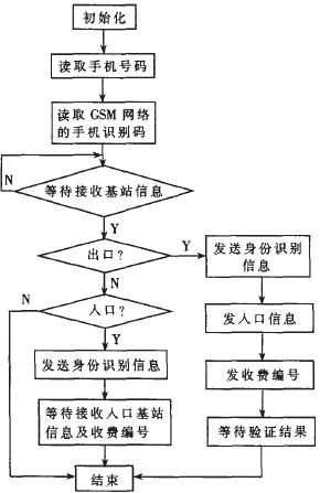 车载系统由一个具有收发短信功能的GSM网络专用模块TC35I、一个单片机控制系统和一个基于蓝牙技术的无线数据通信电路组成。微处理器通过电路以19.2kb/s的速率与GSM模块TC35I相联接,调用手机的国际移动识别码和手机号码,并自动填人身份识别信息中。无线数据通信电路通信距离大于100米,在车辆以40km/h的速度通过公路出入口时,保障在1~3秒内完成身份验证和收费通信。