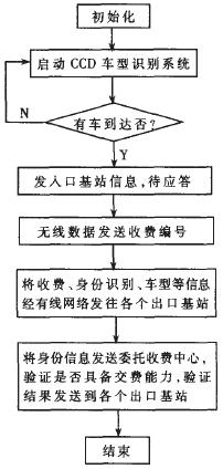 固定系统分为出口基站和入口基站.物理结构基本一样,功能上有所区别。在入口部分,首先通过CCD对即将进入高速公路的车辆的车型进行验证,确定收费价位:然后通过无线数据通信系统发出指令,验证车辆是否具备自动交费系统。在接到机动车内系统的应答并确定该车具备自动交费功能之后.将车辆特征信息、“身份”验证信息及该车的自动收费编号通过调制解调器及固定电话网通知各个出站口的收费系统:同时通过无线数据通信传送到车载系统,以供出站时验证。在车辆放行后,通过电话网验证该车是否具备交费能力。如果某个车不具备自动交费能力或欠费.各个路口的无线系统都将跟踪这个车的行踪,并及时将信息反馈到各个执勤站点.通过执勤人员强制收费。