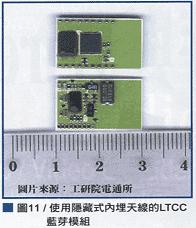 由于陶瓷本身的介质常数较PCB 电路板高,所以使用陶瓷当天线介质能有效缩小天线尺寸;在介质损耗(Dielectric Loss)方面,陶瓷介质也比PCB 电路板的介质损耗更小,所以非常适合用在低耗电率的蓝牙模块使用。除此之外,当蓝牙模块必须利用LTCC 的技术来将模块体积降到最小时,LTCC 蓝牙天线可以轻易的与蓝牙模块整合在LTCC 的多层陶瓷介质中(如图11 所示),将是小型化蓝牙模块的最佳选择。
