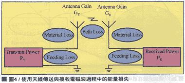 其中,天线的辐射效率高低与电磁波辐射过程中所损失的能量多寡有关。图4 说明了利用天线来做能量传送与接收的过程中所有可能会产生的能量损失,这些损失的能量包括了天线输入端阻抗不匹配造成的能量反射、天线本身的材质在高频下所产生的能量损耗以及在传播介质中所消耗的能量。通常天线增益都以最大值来表示,故可将天线增益简单的以G 来表示,其单位亦为dBi。