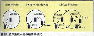 蓝牙的传输模式是以一个微微网(Piconet)为基础,一个微微网内可以同时存在七个蓝牙的从动装置(Slave)与一个主动装置(Master),在同一个微微网内所有从动装置的跳频序列(Frequency Hopping Sequence)必须与主动装置互相配合。如图5 所示,在微微网的基础下可以容许单点对单点(Point to Point)、单点对多点(Point to Multipoint)以及数个微微网互相链接的多种传输模式。在以上这些模式中,不论是微微网内的主动或是从动装置,因为都需要与网内随时改变位置的从动或主动装置联系,故这些装置所使用的天线辐射场型必须是近似全向性的,若是使用指向性过高的天线来做传送或接收,将会造成两个蓝牙装置之间的讯号在某些相对角度上无法正常传送。图6 是在室内环境使用固定式的接取装置(Access Point, AP)来与其它蓝牙装置进行传输的模式。由于接取装置AP 已经被固定在室内的某些适当位置以便对室内的蓝牙装置做数据传输,所以使用在AP 装置上的天线不一定需要全向性,反而是依安装位置及传输范围来设计在固定方向上具有高指向性的天线才能得到最好的传输效果。至于其它的蓝牙装置仍是以全向性的天线最能符合其需求。