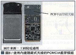 如图7 与图8 以PCMCIA 卡外接方式而言,由于笔记型计算机内的主机板上覆盖有屏蔽金属壳以及接地金属面,故PCMCIA 卡的末端(图7 中的黑色部份)必须突出笔记型计算机之外,而蓝牙天线则以内建隐藏的方式(如图8 所示)设计在内部电路板上或以转接头外接天线的方式(如图7 所示)固定在PCMCIA 卡上;另外,蓝牙天线在笔记型计算机上也将因为摆放的位置不同而有特性上的差异。一般来说,将蓝牙天线置放于LCD 屏幕周围的操作频宽与天线增益会比安装在键盘周围来得大。