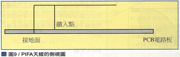 PIFA 天线是以其侧面结构与倒反的英文字母F 外观雷同而命名(如图9 所示)。PIFA 天线的操作长度只有四分之一操作波长,而且在其结构中已经包含有接地金属面,可以降低对模块中接地金属面的敏感度,所以非常适合用在蓝牙模块装置中。另一方面,由于PIFA 天线只需利用金属导体配合适当的馈入及天线短路到接地面的位置,故其制作成本低,而且可以直接与PCB 电路板焊接在一起。PIFA 天线的金属导体可以使用线状或是片状,若以金属片状制作则可设计为SMD 组件来焊接在电路板上达到隐藏天线的目的。此时为了支撑金属片不与接地金属面产生短路,通常会在金属片与接地面之间加入绝缘的介质,如果使用介质常数(Dielectric Constant)较高的绝缘材质还可以缩小蓝牙天线的尺寸。