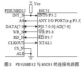 PDIUSBD1 与80C51的连接电路如图3所示。在这个例子中,ALE始终接低电平,说明采用单独地址和数据总线配置。A0脚接80C51的任何I/O引脚,控制是命令还是数据输入到PDIUSBD12。80C51的P0 口直接与PDIUSBD12 的数据总线相连接。CLKOUT时钟输出为80C51提供时钟输入。